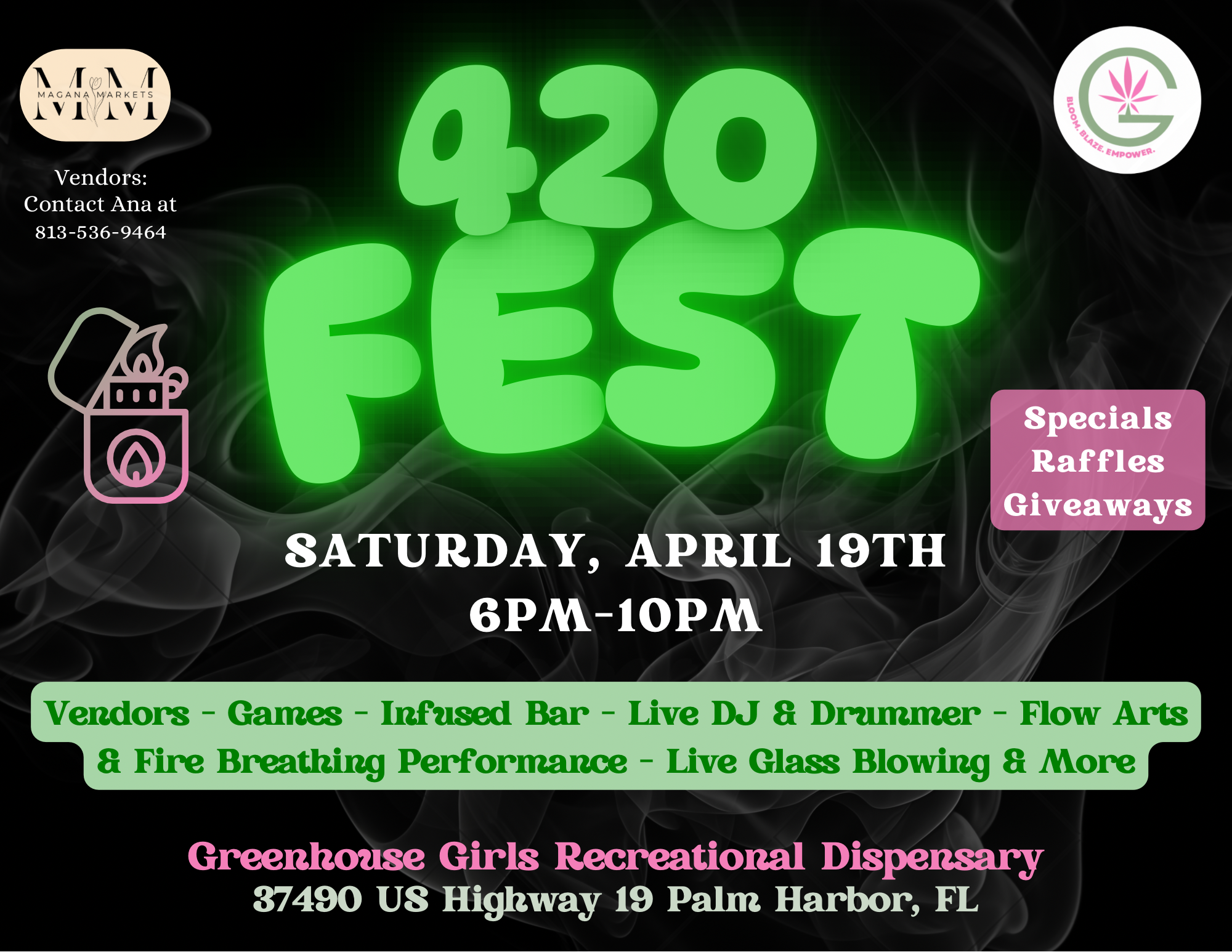 Get ready for a day of good vibes, great people, and top-tier products at 420 Fest! Join us on April 19th as we celebrate all things cannabis at the Greenhouse Girls Recreational Dispensary in Palm Harbor. π